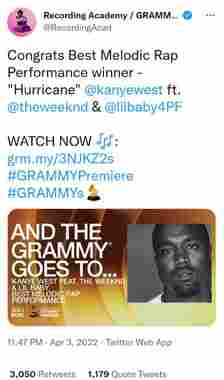 These groups included Sound Unlimited Posse Hilltop Hoods. Kanye West Misses Grammys Wins 2 Awards For Donda. 22 rows The Grammy Award for Best Melodic Rap Performance awarded as Best RapSung Collaboration until 2017 and Best RapSung Performance from 2018 to 2020 is an honor.